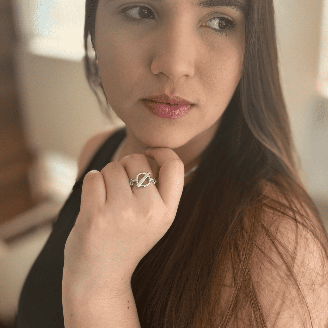 Um anel elegante e diferenciado, com um círculo central e uma linha diagonal que atravessa o design, perfeito para composições refinadas. Ele possui um toque moderno e elegante para mulheres que sabem valorizar o design e o estilo único. Disponível nos tons dourado e prateado.