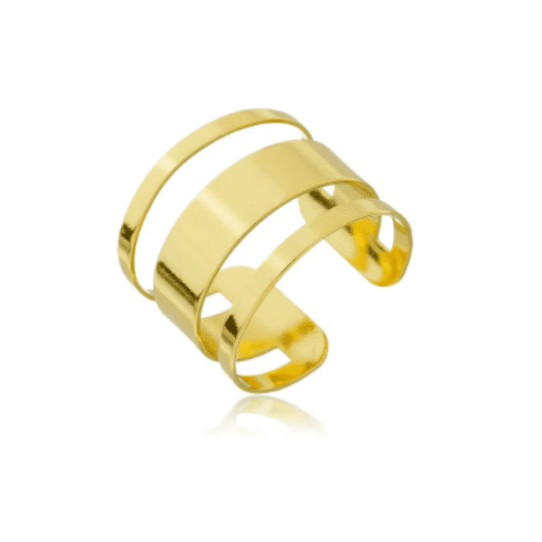 Adicione um toque de modernidade e sofisticação ao seu estilo com nosso anel banhado a ouro regulável, caracterizado por três cortes vazados. Esta peça única combina um design contemporâneo com a elegância clássica do ouro, tornando-a um acessório indispensável para qualquer ocasião.