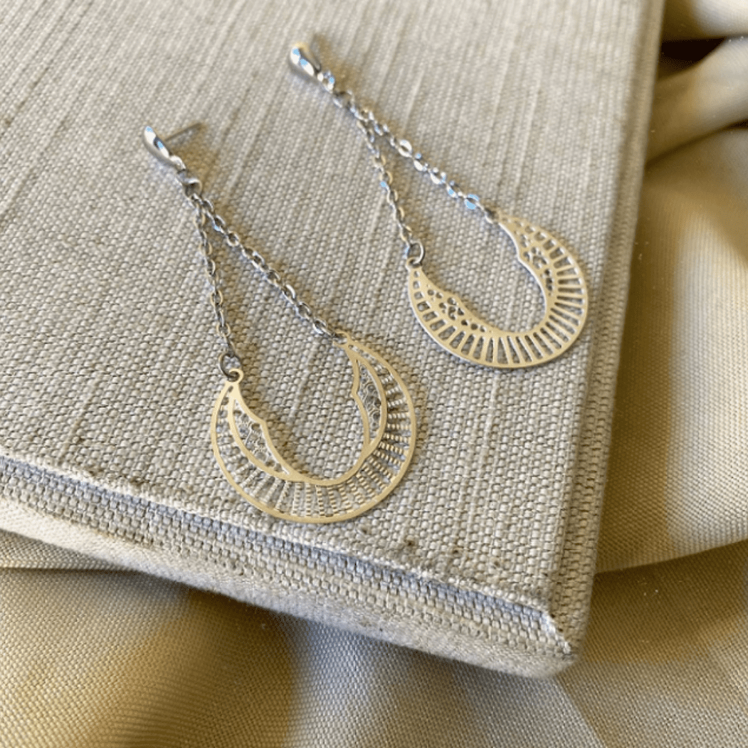 Enalteça a beleza da noite e da lua com este brinco encantador. O design pendente em forma de meia lua adiciona um toque de mistério e elegância.