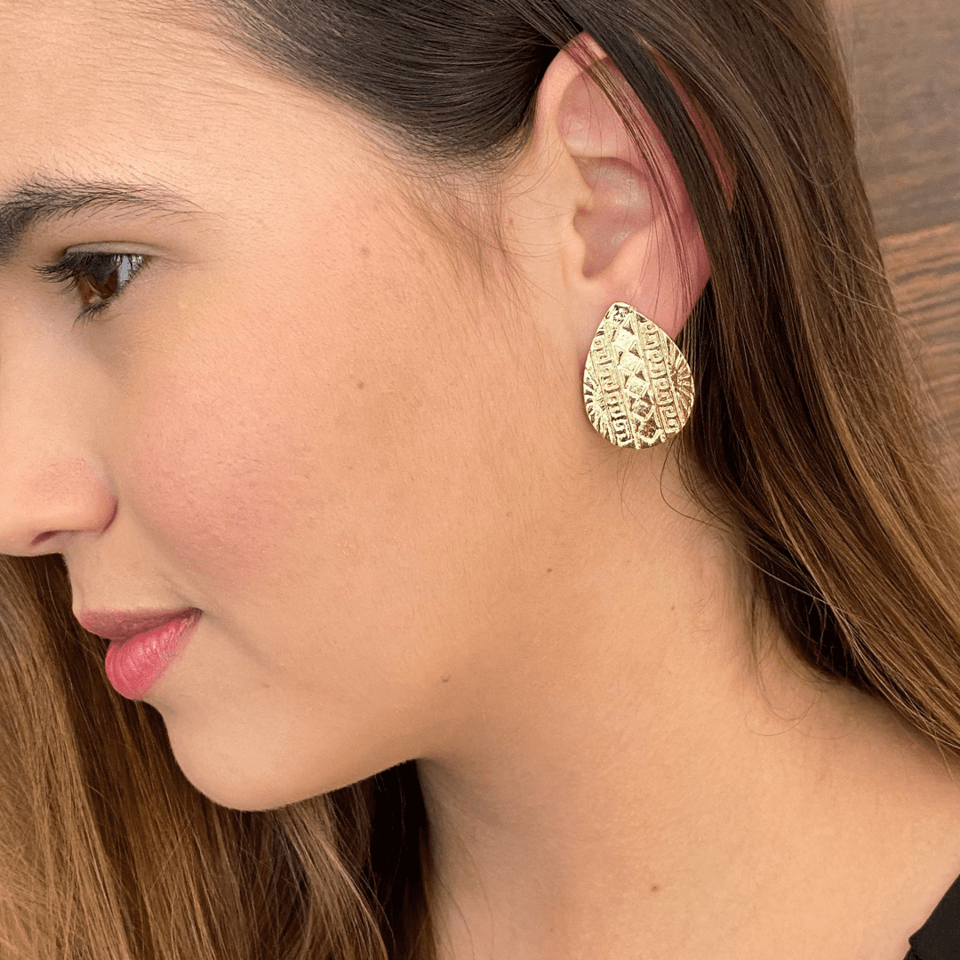 O brinco em formato de gota apresenta uma superfície delicadamente gravada com desenhos abstratos, criando um visual que é ao mesmo tempo artístico e moderno. As gravuras abstratas conferem uma textura interessante à peça, destacando-se pela sua complexidade e charme.