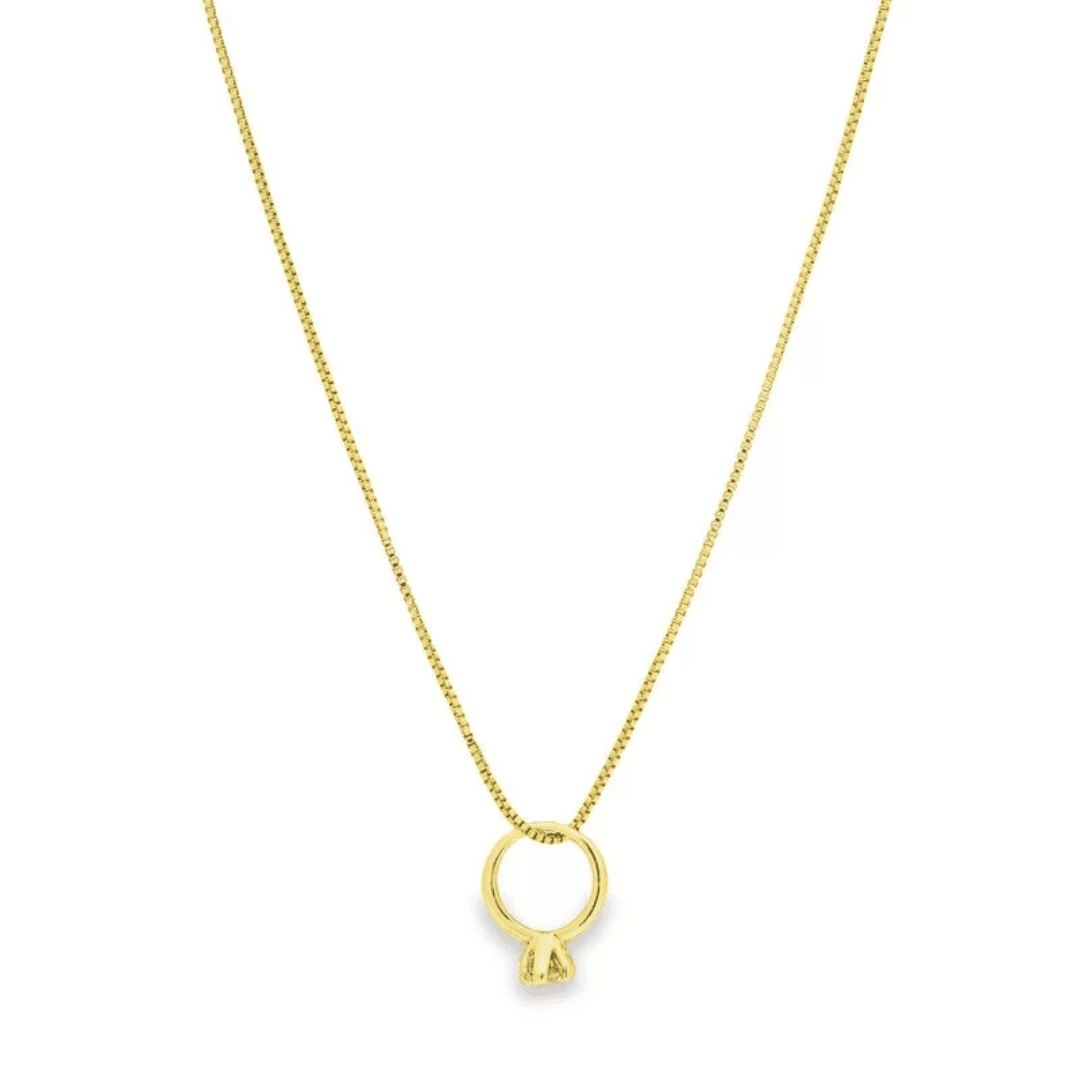 Um símbolo de elegância atemporal. Este colar exibe um encantador pingente, replicando um anel solitário em detalhes finos. Banhado em ouro 18k, é uma declaração delicada de estilo e sofisticação, perfeito para elevar seu visual com um toque de luxo.