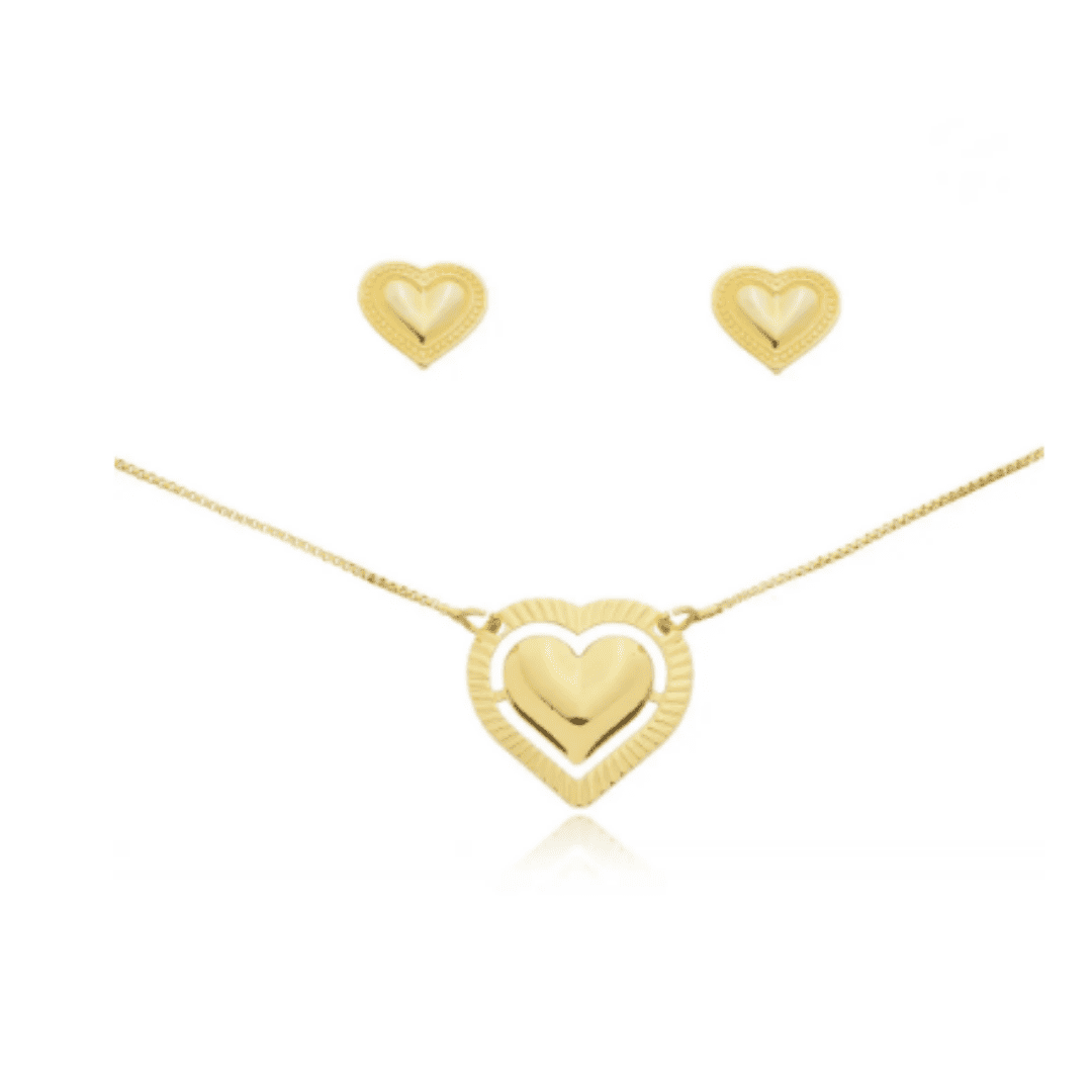 Adicione um toque de romance e sofisticação ao seu estilo com nosso conjunto coração banhado a ouro. Este conjunto encantador é a personificação do amor e da elegância, perfeito para presentear alguém especial ou para se mimar com um acessório luxuoso.