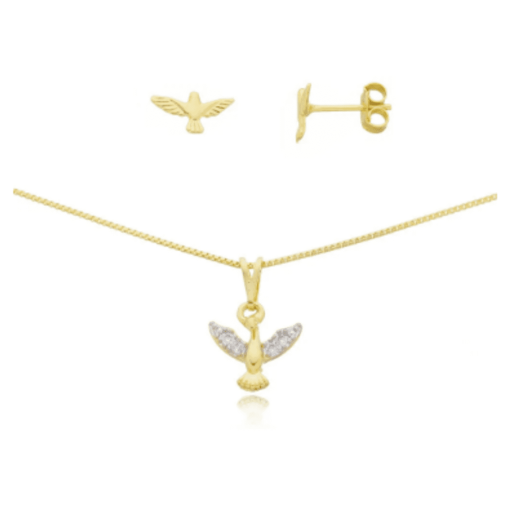 Desperte a espiritualidade e a elegância com nosso conjunto banhado a ouro, adornado com um pássaro de asas abertas, simbolizando o Espírito Santo. Este conjunto delicado e significativo é perfeito para expressar sua fé com estilo e sofisticação.