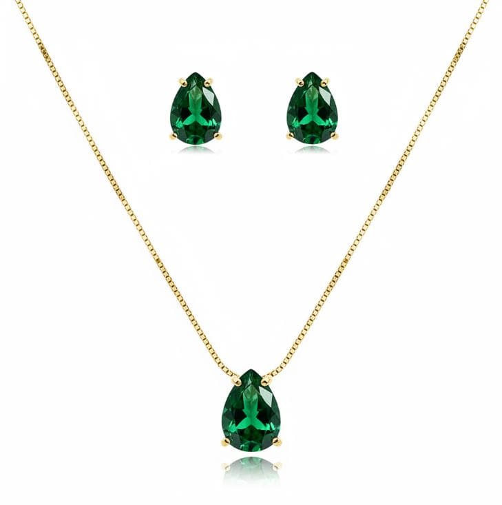 O Conjunto Gota Verde Esmeralda Dourado é uma joia clássica que transmite sofisticação e requinte. Composto por colar e brincos, o destaque fica por conta das zircônias verdes em formato de gota, que refletem a luz com intensidade e adicionam um toque de cor elegante ao visual. O banho dourado completa a peça com brilho e acabamento refinado.