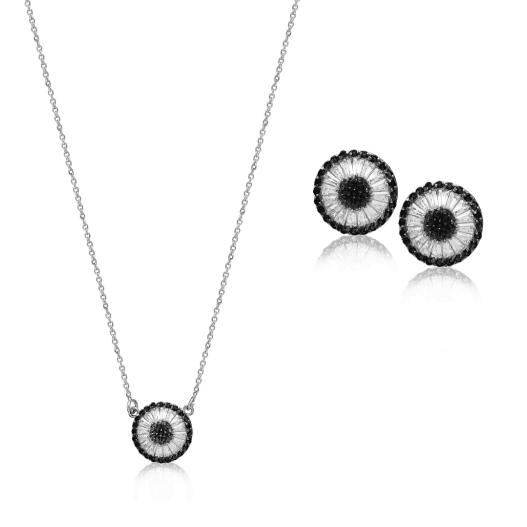 Composto por colar delicado e brincos redondos, ambos apresentam um design em camadas de zircônias pretas e cristais, formando um efeito radiante e atemporal.