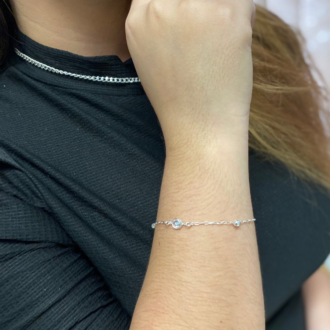A pulseira é composta por uma sequência de bolinhas em prata 925, criando uma textura interessante e um visual harmonioso. No centro, um ponto de luz com zircônia adiciona um toque de brilho e sofisticação, destacando-se de maneira sutil.