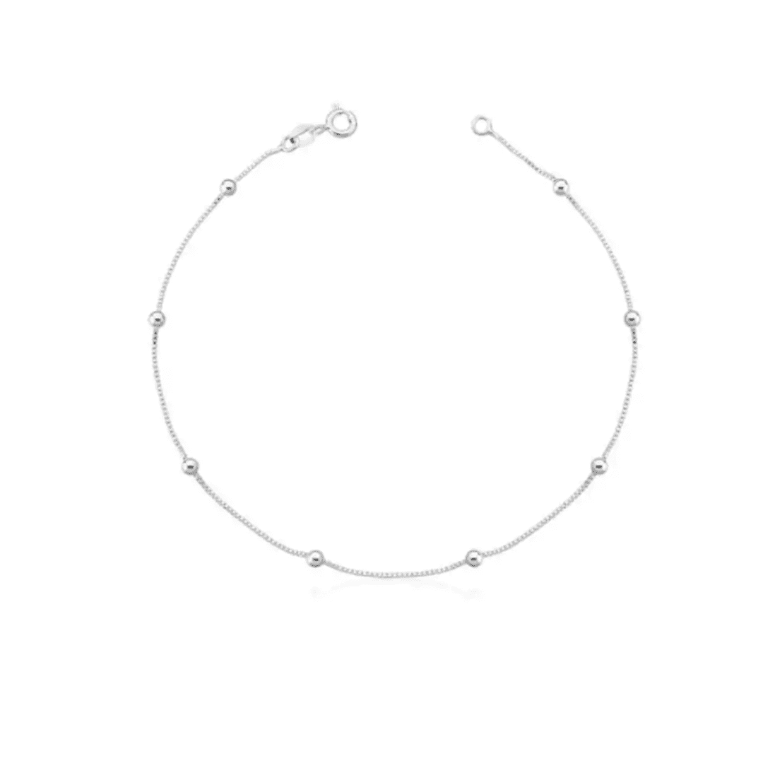 Cada bolinha reflete a qualidade excepcional do material, criando uma peça que une delicadeza e sofisticação. Leve e versátil, esta tornozeleira é um convite para destacar seus tornozelos com um toque de brilho autêntico.